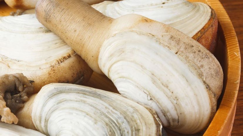 The Geoduck, a species of the Hiatellidae family, is noted for its long siphon and large shell, and as such is the largest burrowing clam in the world.